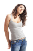 portret pięknej młodej kobiety, pozowanie na białym tle