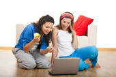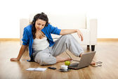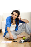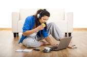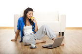 Portrait of a girl seated on floor calling on phone