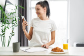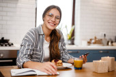 Europejska młoda kobieta pijąca kawę podczas śniadania w kuchni w domu
