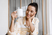 Zdjęcie "Europejska młoda kobieta pijąca kawę podczas śniadania w kuchni w domu" może być wykorzystywane do celów osobistych i komercyjnych zgodnie z warunkami zakupionej licencji Royalty-free. Obraz jest dostępny do pobrania w jakości wysokiej rozdzielczości do 5760x3840.