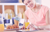 Europejska uśmiechnięta kobieta robi zdjęcia przez telefon komórkowy podczas śniadania w kuchni w domu