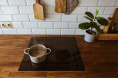 Wrząca woda w garnku gotowania patelni na indukcyjnym piecu w nowoczesnym białej kuchni widok z boku