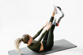 Slim młody biały sportowiec ćwiczenia na macie fitness w studio, ćwiczenia brzucha