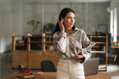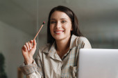 Zdjęcie "Młoda brunetka uśmiecha się i pracuje z laptopem w biurze" może być wykorzystywane do celów osobistych i komercyjnych zgodnie z warunkami zakupionej licencji Royalty-free. Obraz jest dostępny do pobrania w jakości wysokiej rozdzielczości do 5760x3840.