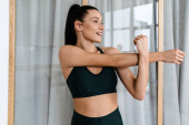 Biała brunetka uśmiechnięta i ćwicząca podczas treningu w domu
