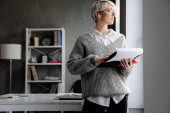 Młoda brunetka pije kawę podczas pracy z rysunkami w biurze