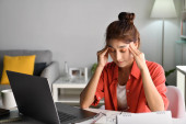 Młoda brunetka pracuje z rysunkami siedząc przy biurku w biurze