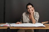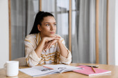 młody zamyślony dorywczo brunetka biały kobieta siedzi praca w biurowy biurko z formalności