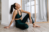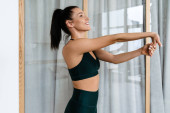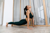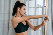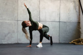 Biała brunetka robi ćwiczenia podczas treningu w domu