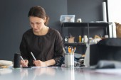 młoda brunetka biały kobieta siedzi w biuro biurko z papierkową robotą