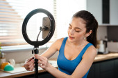 Zdjęcie "Młoda, uśmiechnięta, biała kobieta blogerka piękności w bahtrobe kręci filmik na telefonie komórkowym w łazience z kremem do twarzy z pleców rurki" może być wykorzystywane do celów osobistych i komercyjnych zgodnie z warunkami zakupionej licencji Royalty-free. Obraz jest dostępny do pobrania w jakości wysokiej rozdzielczości do 5760x3840.