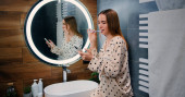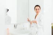 Młoda, uśmiechnięta, biała kobieta blogerka piękności w bahtrobe kręci filmik na telefonie komórkowym w łazience z kremem do twarzy z pleców rurki