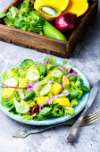 Sałatka wegańska owoce i warzywa danie z awokado, owoce smoka, rzodkiew, dynia, pomidor, sałatka kukurydziana, sałata, mizuna i cytryna na niebieskim tle. Zdrowa żywność