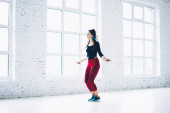 Młoda brunetka biały kobieta taniec współczesny w studio widok z góry