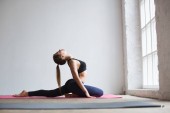 Młoda szczupła brunetka fitness kobieta rozciągająca się na macie sportowej w studio
