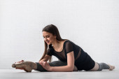 Uśmiechnięta młoda brunetka biała kobieta na odzieży sportowej siedząca w split na podłodze studia