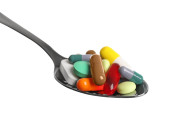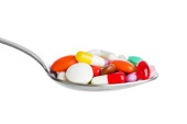 Różne kolorowe tabletki w łyżce izolowane na białym