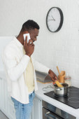 widok z boku młody Afryki człowiek gotowanie w kuchni