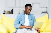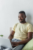 młody afrykański freelancer wpisując na laptopie siedząc na żółtej kanapie