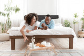 Zdjęcie "Afrykański Amerykanin siedzi ze skrzyżowanymi nogami przy łóżku podczas śniadania" może być wykorzystywane do celów osobistych i komercyjnych zgodnie z warunkami zakupionej licencji Royalty-free. Obraz jest dostępny do pobrania w jakości wysokiej rozdzielczości do 5760x3840.