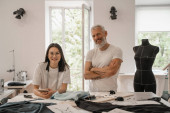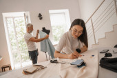 Uśmiechnięci projektanci międzyrasowi machający rękami na laptopie w pobliżu szkiców i tkanin
