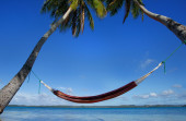młoda kobieta w bikini siedzi w hamaku pomiędzy palmami, o