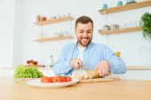 Młody człowiek wlewa zdrowy zielony smoothie do szkła w kuchni