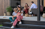 Dwoje ciekawskich dzieciaków ze smartfonem przewijającym filmy online