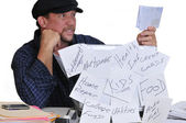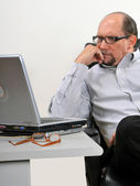 biznes człowiek siedzi w jego pracy informacji turystycznej. postawę człowieka i wygląd może prowadzić do wielu problemów fizycznych.