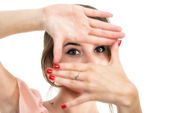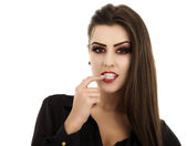 portret młodej kobiety uśmiechający się z łyżeczką w ustach i