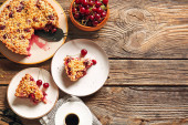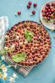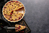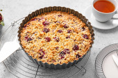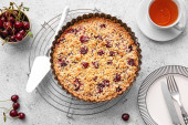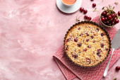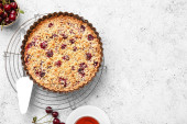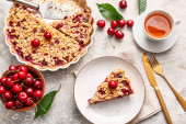 Talerz z kawałkiem smacznego placka wiśniowego na jasnym tle