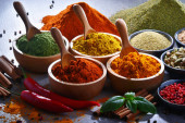 Zdjęcie "Różnorodność przypraw na drewnianym stole kuchennym." może być wykorzystywane do celów osobistych i komercyjnych zgodnie z warunkami zakupionej licencji Royalty-free. Obraz jest dostępny do pobrania w jakości wysokiej rozdzielczości do 5760x3840.