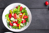 Zdjęcie "sałatka świeże warzywa sałata liści pomidora, ogórek, cebula, pieprz przekąska posiłek na zewnątrz na stole kopia przestrzeń żywności tło rustykalne. top view keto lub dieta paleo wegetariańskie wegetariańskie lub wegetariańskie jedzenie" może być wykorzystywane do celów osobistych i komercyjnych zgodnie z warunkami zakupionej licencji Royalty-free. Obraz jest dostępny do pobrania w jakości wysokiej rozdzielczości do 5760x3840.