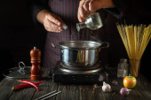 Zdjęcie "Profesjonalny kucharz dodaje oleju do rondla podczas robienia pierogów. Środowisko pracy na zabytkowym stole kuchennym w restauracji. Obraz pionowy" może być wykorzystywane do celów osobistych i komercyjnych zgodnie z warunkami zakupionej licencji Royalty-free. Obraz jest dostępny do pobrania w jakości wysokiej rozdzielczości do 5760x3840.