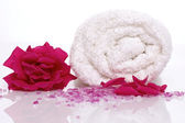 zwinięte ręcznik z koralikami kąpiel na białym tle różowy