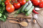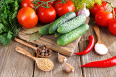 świeże warzywa, zioła i przyprawy na stole, szczelnie-do góry