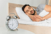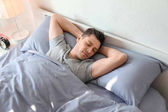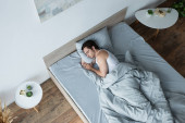 młody brunetka człowiek śpi w łóżku pod niebieski koc
