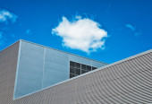 nowoczesny budynek z przeszklonymi ścianami przeciw błękitne niebo.