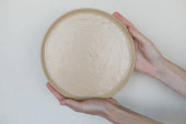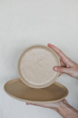 ceramiczne kubki i talerze na drewnianym widoku blatu. minimalistyczny zestaw ręcznie wykonanych ceramicznych zastaw stołowych i ceramicznych
