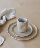 ceramiczne kubki i talerze na drewnianym widoku blatu. minimalistyczny zestaw ręcznie wykonanych ceramicznych zastaw stołowych i ceramicznych