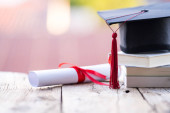 Zamknięte zdjęcie moździerza ukończenia college 'u z dyplomem i maską na stole. Zakończenie studiów w dobie COVID-19