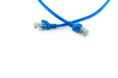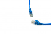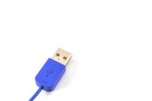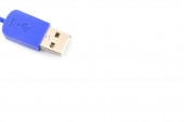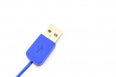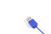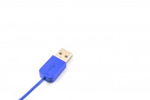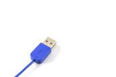Zbliżenie niebieskiego kabla wtykowego USB izolowanego na białym tle