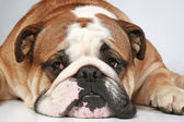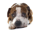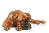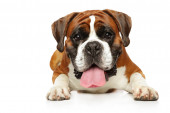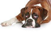 smutny pies rasy bokser niemiecki, leży na białym tle