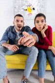 Martwiona Afroamerykanka trzymająca pilota w pobliżu chłopaka ze smartfonem w domu