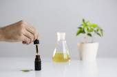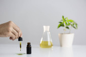 Widok człowieka trzymającego pipetę w pobliżu butelki oleju cbd