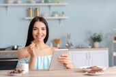 Piękna młoda kobieta z laptopem jedząca smaczne nachos w domu
