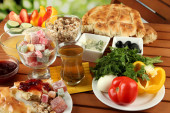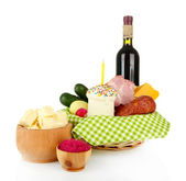 kosz Wielkanocny: koncepcyjne zdjęcie tradycyjne potrawy wielkanocne w wiklinowym koszu, na białym tle