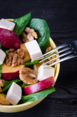 Koncepcja smacznego jedzenia z sałatką z grillowaną brzoskwinią, widok z góry