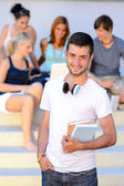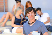 studentów kolegium chłopiec siedzi ziemi z przyjaciółmi