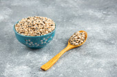 Zdjęcie "Biała fasola nerkowa w niebieskiej misce z łyżką. Wysokiej jakości zdjęcie" może być wykorzystywane do celów osobistych i komercyjnych zgodnie z warunkami zakupionej licencji Royalty-free. Obraz jest dostępny do pobrania w jakości wysokiej rozdzielczości do 5760x3840.